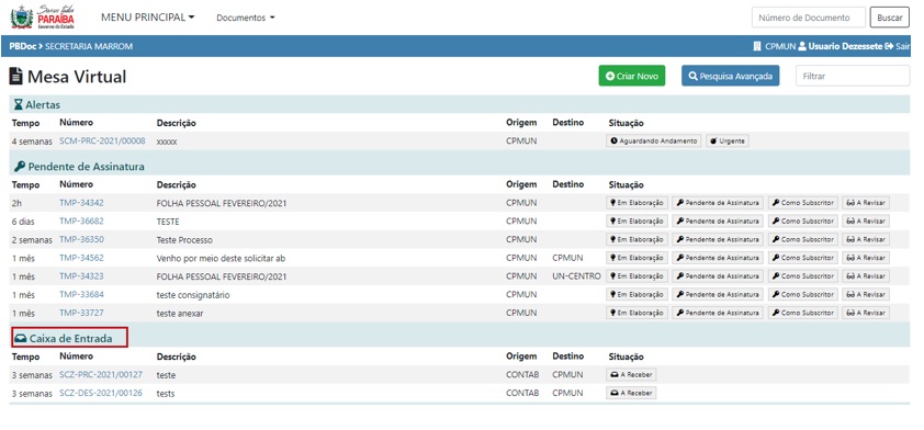 caixa de entrada aguardando andamento